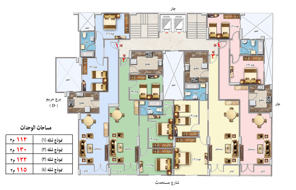 The tower is on the corner of Singer Street with Noureddine Street The tower consists of a basement, garage, commercial ground, and 8 residential floors Floor 6 apartments The spaces start from 115 m to 168 m