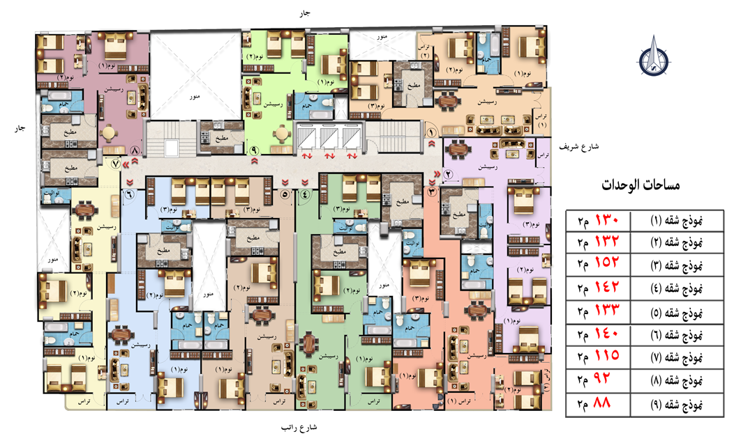 The tower is on the corner of Ratib Street with Sharif Street. The tower consists of a ground floor garage and eleven residential floors The spaces range from 88 meters to 152 meters