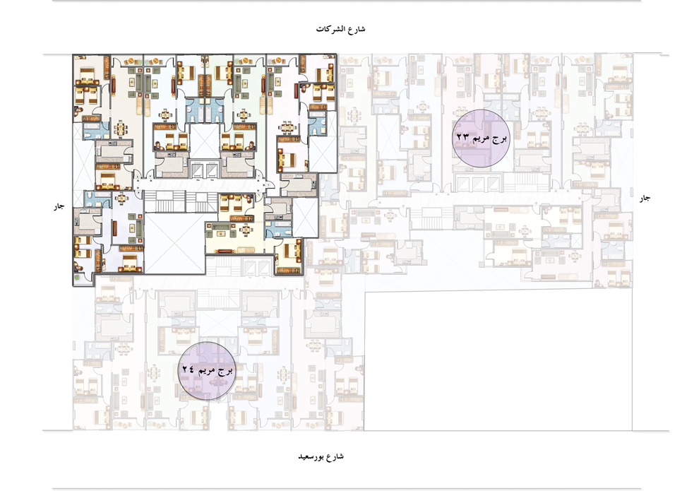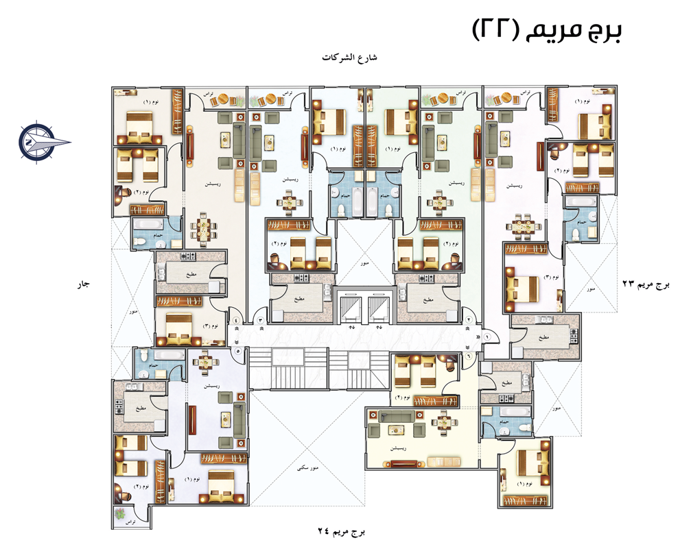 The tower overlooks Companies Street, and it consists of a garage, commercial ground, the first administrative floor, and ten residential floors. The areas in the tower range from 90 meters to 135 meters.