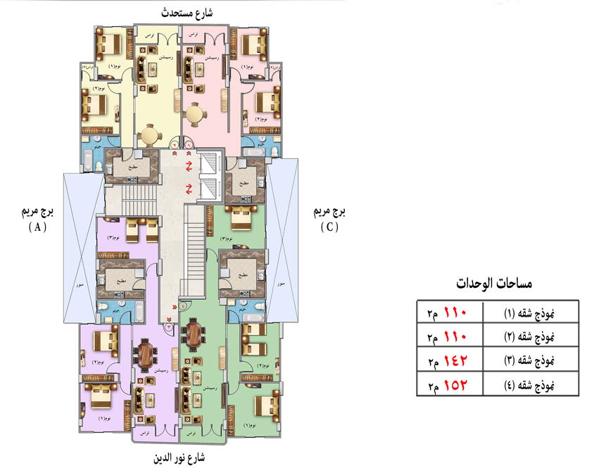 The tower is on Noureddine Street The tower consists of a basement, garage, commercial ground, and 8 residential floors Floor 4 apartments The spaces start from 110 m to 152 m